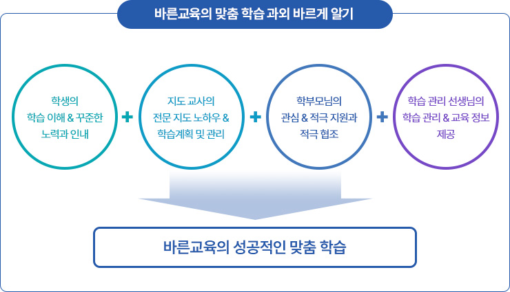 바른교육은 좋은 결과를 내기 위해서는 학생과 학부모님, 지도 교사와 학습 관리 교사 모두가 한마음으로 한뜻으로 힘껏 노력해야 한다고 강력하게 말씀드립니다.